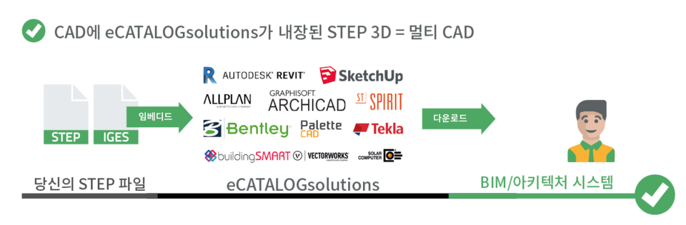 eCATALOGsolutions을 사용하면 3D STEP / CAD 모델이 자동으로 적합한 포맷으로 변환됩니다. 따라서 귀하의 제품은 유명한 BIM / Architecture CAD 시스템으로 설계된 계획 및 건물에 통합 될 수 있습니다. 이렇게 하면 97 % 이상의 시장 커버리지를 얻을 수 있습니다.
