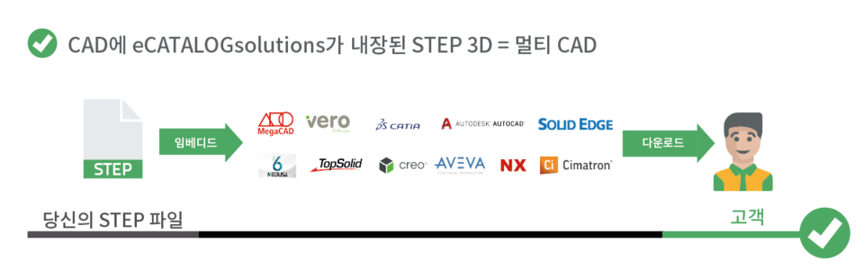 CADENAS eCATALOGsolutions 기술로 강화된 CAD 데이터는 기존의 STEP 파일로 계속 사용할 수 있습니다. 그러나 우리의 기술은 이러한 파일들을 120가지 포맷의 네이티브 포맷으로 변환하는 동시에 PIM 시스템의 BOM 및 eProcurement 정보로 풍부하게 할 수 있습니다. 따라서 고객과 잠재 고객은 CAD 데이터를 손쉽게 다운로드하여 자신의 설계에 통합할 수 있습니다.